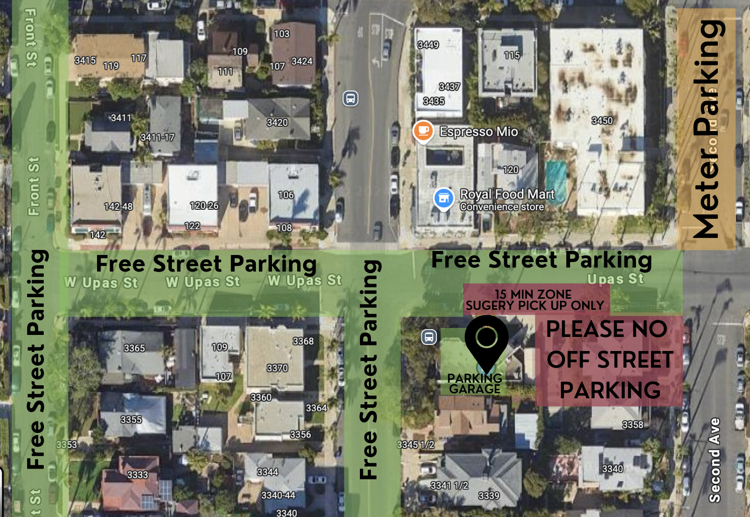 This is a map of our office location showing that there is garage parking under our building, free street parking on Front St, Upas St, and First Ave. There is metered parking on Sedond Ave. There is a 15 minute zone in front of the office that is for surgery pick up only. Please do not park off the street in the driveway.